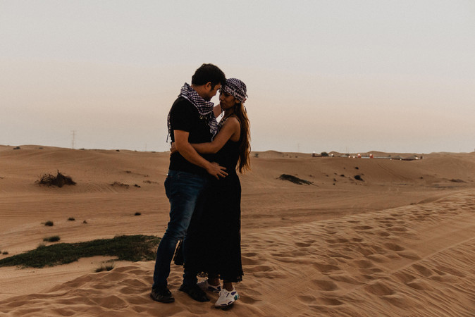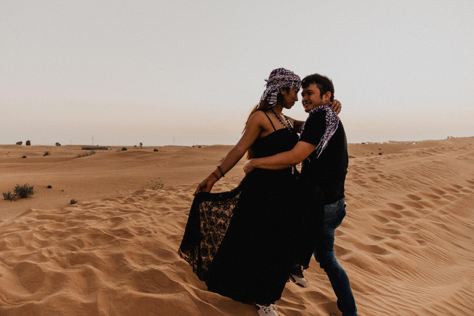 Délután 14:00 óra. A dubaji Lulu Village bevásárlóközpont parkolójában állunk. Várjuk a sofőrt, hogy megtaláljuk egymást és a kisbusszal elindulhassunk az újabb kalandra: a sivatagba. Elinduláskor a sofőr bekapcsolja a rádiót, amiben arab zene szól. Hátul a buszban egy indai apuka dúdolja. Lassan haladunk a dugóban és miközben a dalolászását hallgatom, lecsukódik a szemem és elszundítok. Amikor újra kinyitom, már a sivatag tárul a szemem elé. Sehol semmi. Csak középen az út és körülötte a homok. Már több, mint másfél órája utazunk. Megállunk. Reménykedek, hogy végre megérkeztünk. Csak egy gyors kitérő volt, hogy a helyiektől vásároljunk. Én már nagyon mennék tovább. Végre továbbindulunk. És csak megyünk és megyünk. Egyszer csak jobbra meglátok egy tevét és a kis borját. A sivatagban. A szabadban. Közben fürdök az ablakon át beszűrődő napfény sugaraiban. Megérkezünk. Most jön az izgi része. Jeep-be átszállunk, kezdődik a "sivatagi rally", hogy beljebb jussunk. Kapaszkodunk. Sikítunk. A legnagyobb dűnékre felhajtunk. Itt vagyunk. A sivatagban. A homok selymes. A repülők csillagokként ragyognak az égen. A nap kereken, tűzpirosan világít. Hamarosan lemegy. Itt vagyok a sivatagban. Kezemben a fényképezőm. Most vagy soha. Jön a gondolat és még az utolsó lemenő sugarak előtt odasietek egy fotózkodó párhoz. Bemutatkozom. Elmondom, ki vagyok és mivel foglalkozom. Kedvesen fordulnak felém. Nagyon örülnek nekem. 10 percünk van. Készítünk egy random sorozatot. Novemberben, 28 fokban, a sivatag közepén, a naplementében.